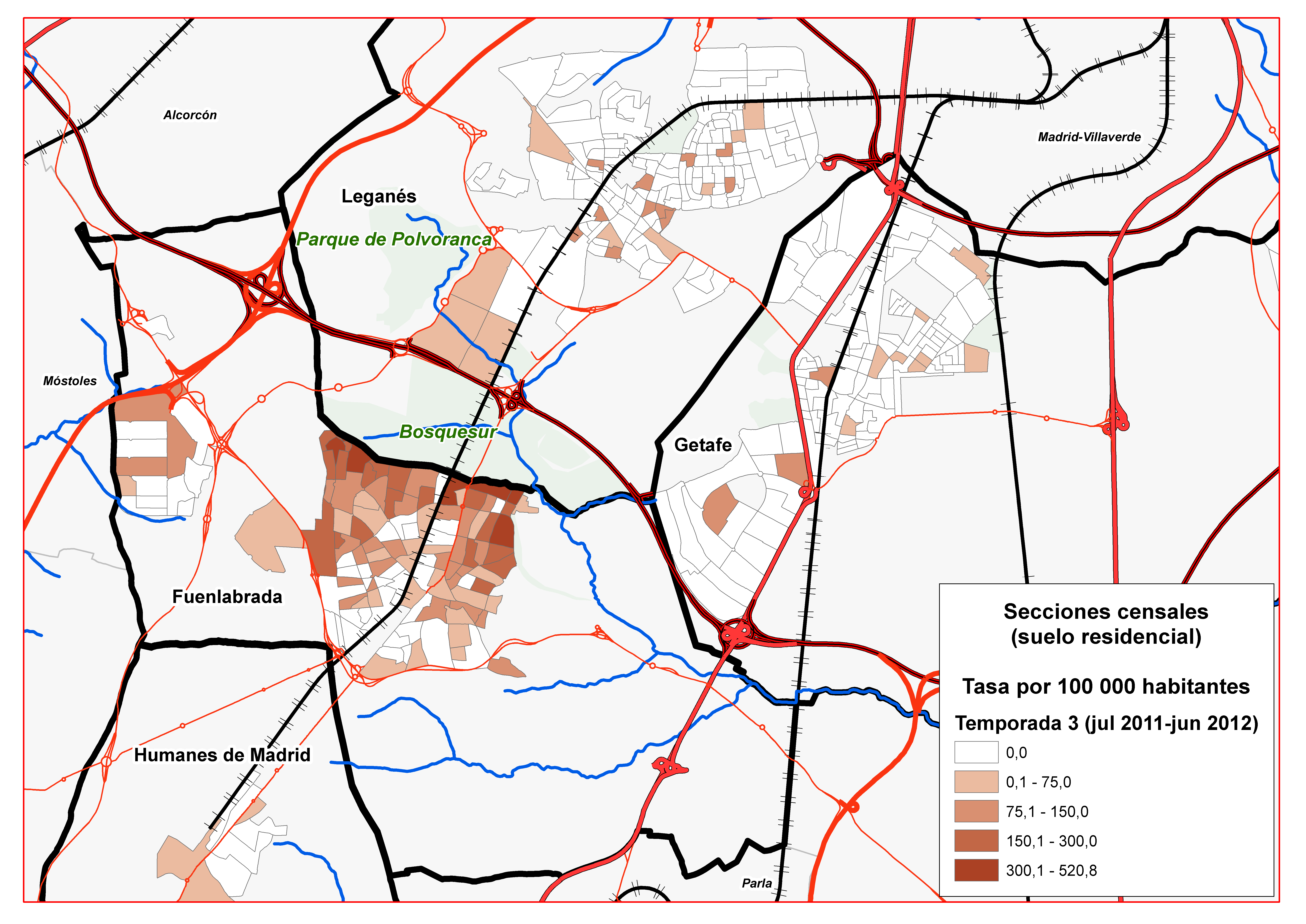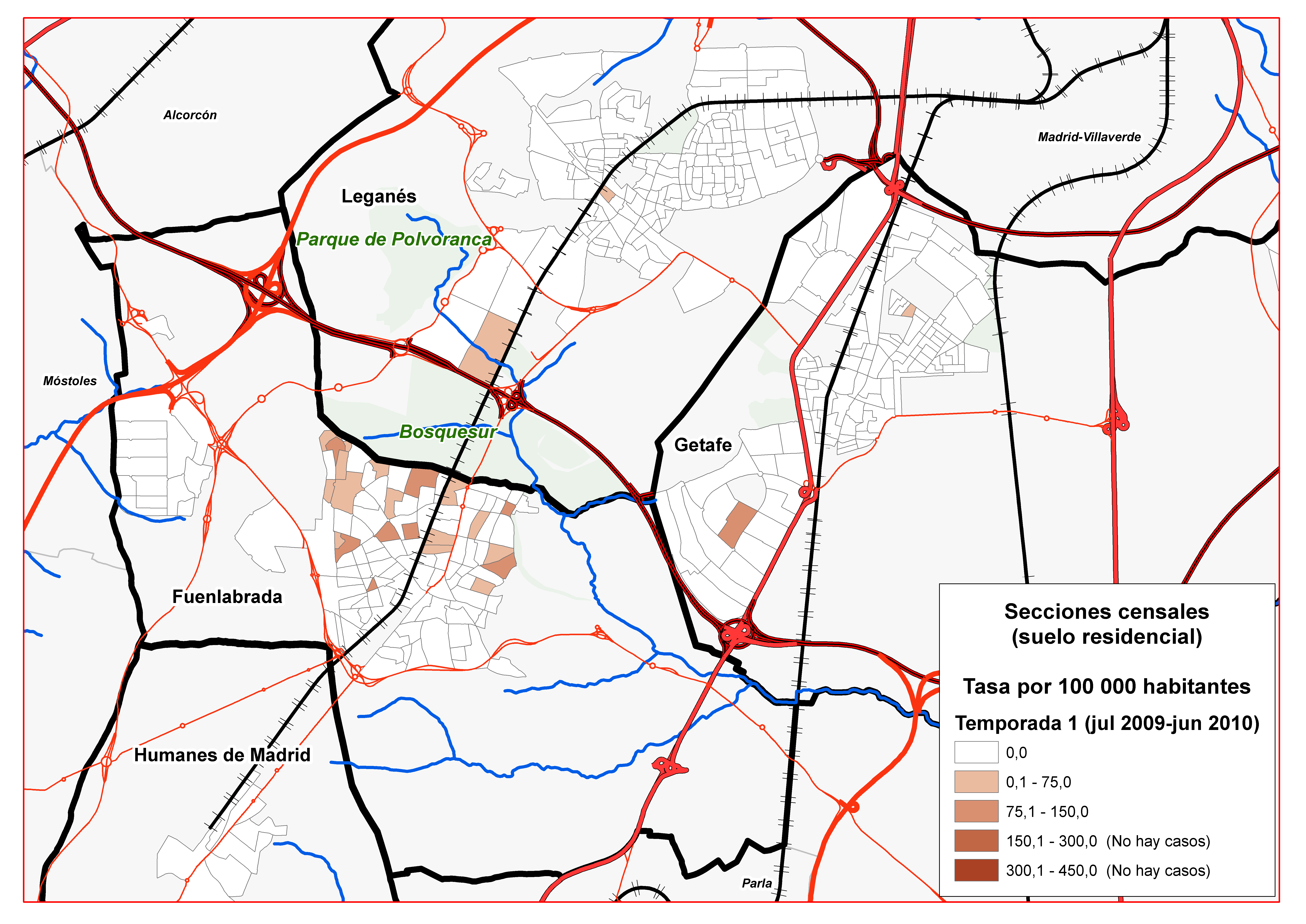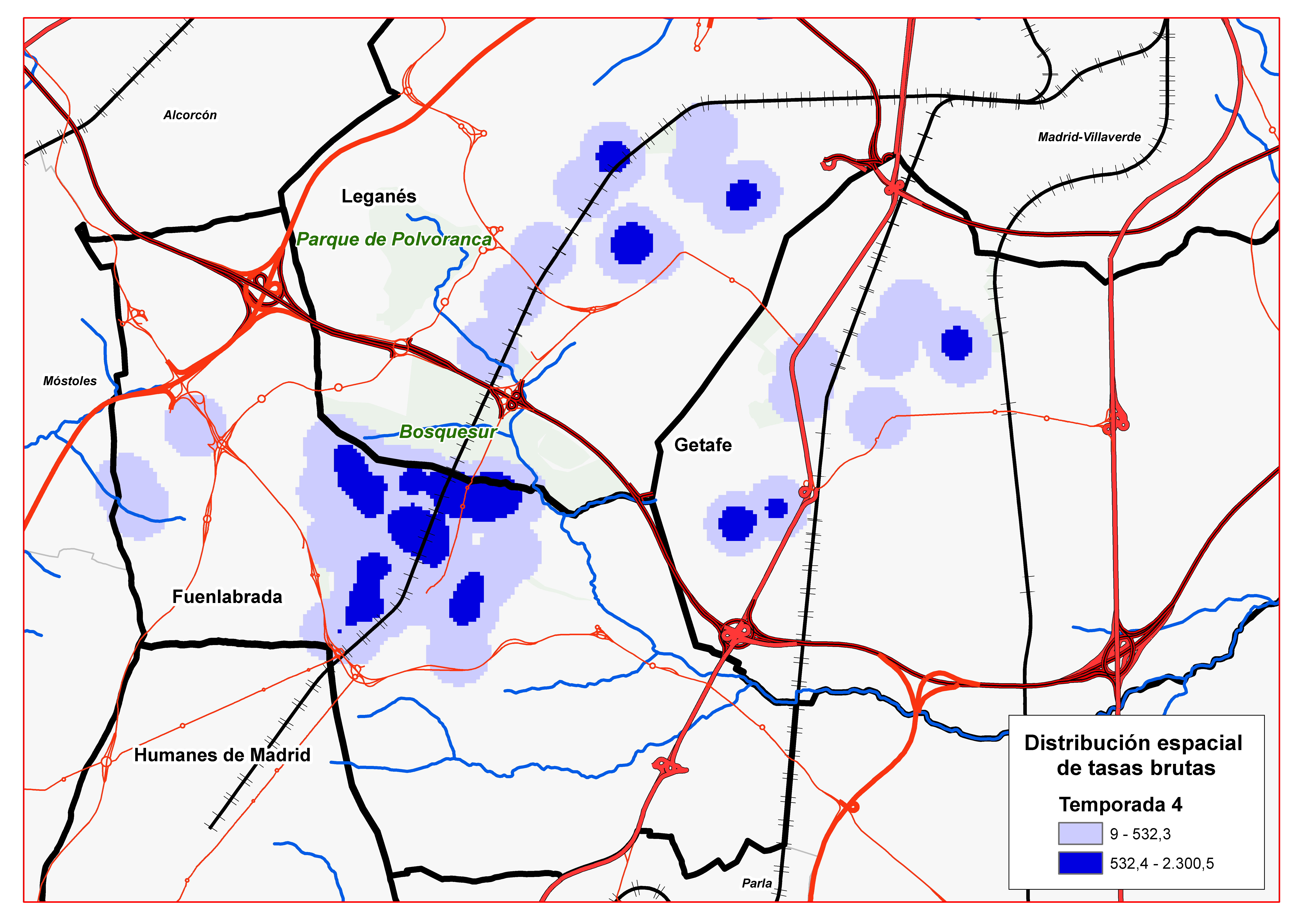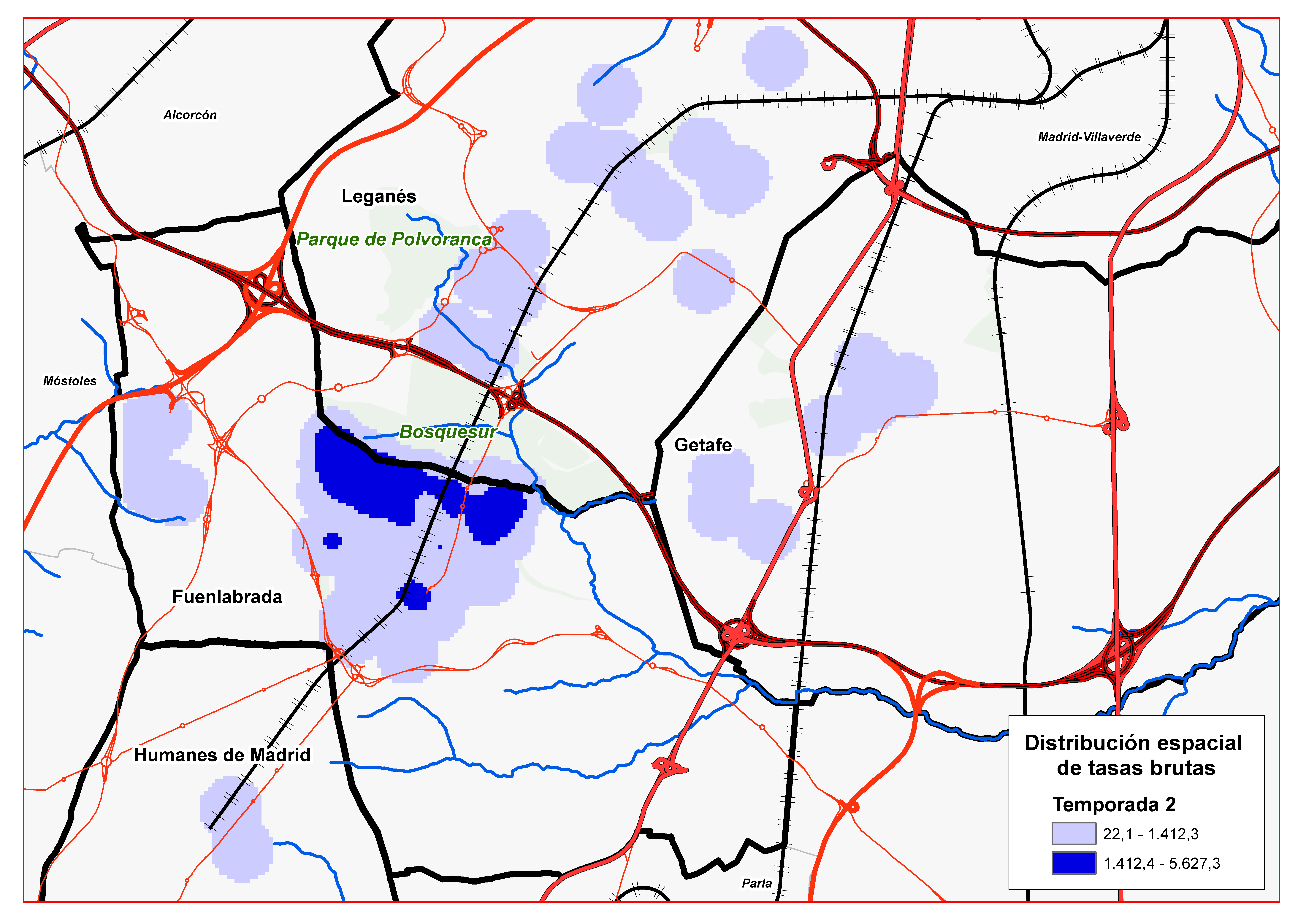 La mayor parte de los casos se localizaron en el norte de Fuenlabrada. Los resultados del análisis espacial pusieron de manifiesto que, durante el periodo de estudio, la zona con mayor concentración de casos coincidió espacialmente con áreas residenciales periféricas inmediatas a espacios verdes con alta densidad de flebotomos y prevalencia relativamente elevada de leishmaniasis en lagomorfos. Esto informa de que la exposición principal ocurre en su entorno domiciliario o peridomiciliario.